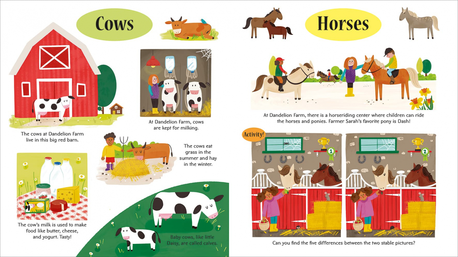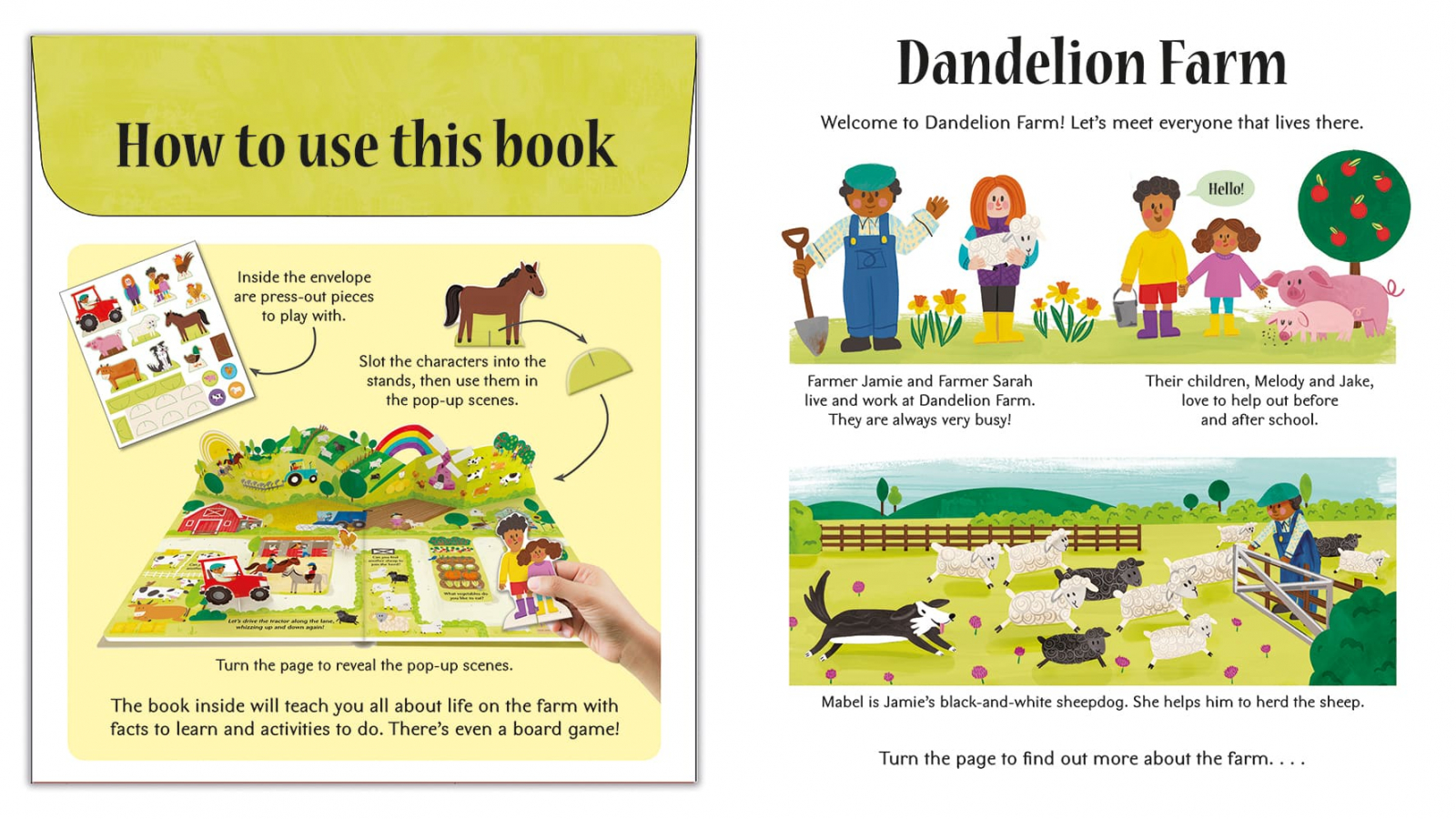 Învață despre viața la fermă cu ajutorul paginilor cu informații, apoi, în centrul cărții, descoperi două fundaluri pop-up care creează o scenă de la fermă. Există, de asemenea, personaje și animale detașabile cu care poți interacționa în cadrul scenelor, creând un spațiu de joacă unic. Odată ce te-ai jucat cu ele, piesele detașabile pot fi depozitate în plicul inclus, astfel încât această carte poate fi transportată și savurată cu ușurință iar și iar. Există mici sugestii text pentru a încuraja copiii să exploreze:
