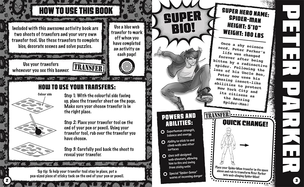Pregătește-te să-ți transferi complet abilitățile creative în această minunată carte de activități Spider-Man! Plină de povești, materiale de colorat și jocuri de rezolvat, folosește instrumentul unic de vârf pentru a freca peste transferuri(stickere), apoi urmărește-le cum apar ca prin magie pe pagina !