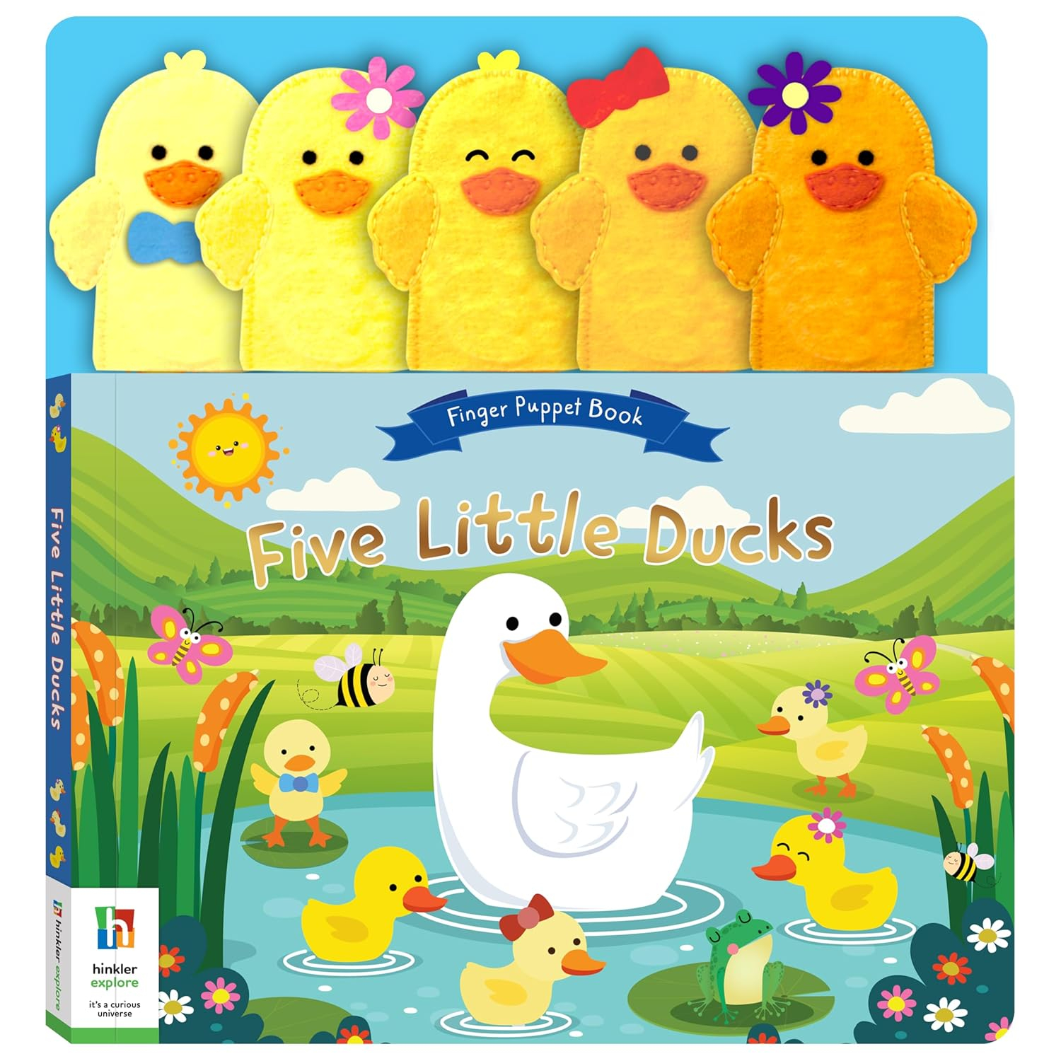 Quack, quack, read, and play! Dive into giggles and fun with our Five Little Ducks Finger Puppet Book! With adorable illustrations and five cuddly felt finger puppets, this board book brings the beloved nursery rhyme to life on each of its 10 spreads. Watch as your little one's eyes light up, engaging with the story and playing along with the cute ducklings. Designed for tiny hands and big imaginations, it's the perfect companion for little ducklings aged 0-3! Let the quacktastic adventures begin!